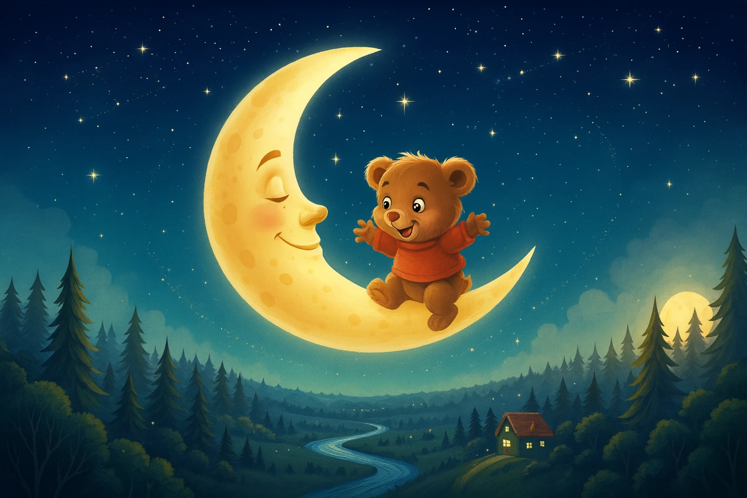 他坐在月亮的边缘,晃荡着小短腿,看着下面的森林变得越来越小,越来越远。他看到了自己的小房子,就像一个小火柴盒。